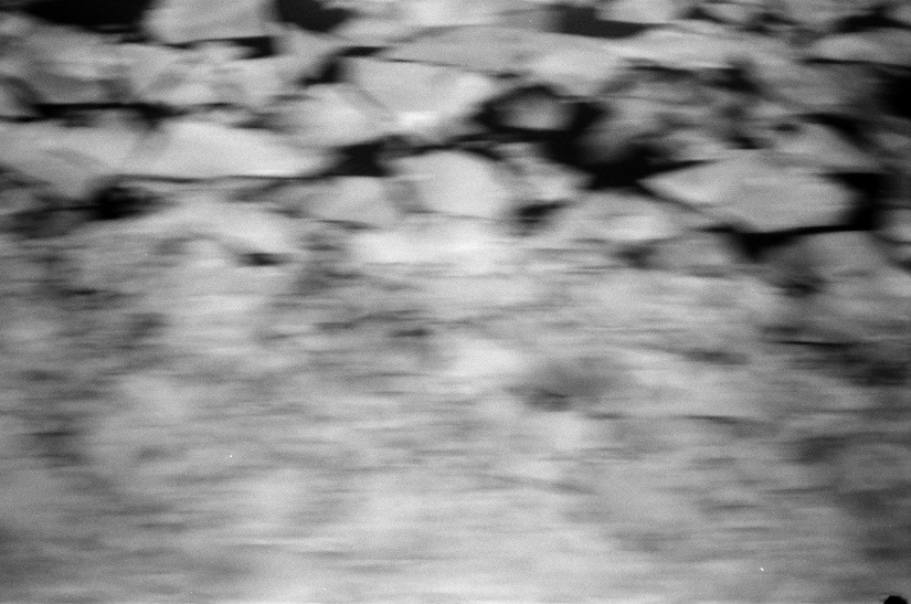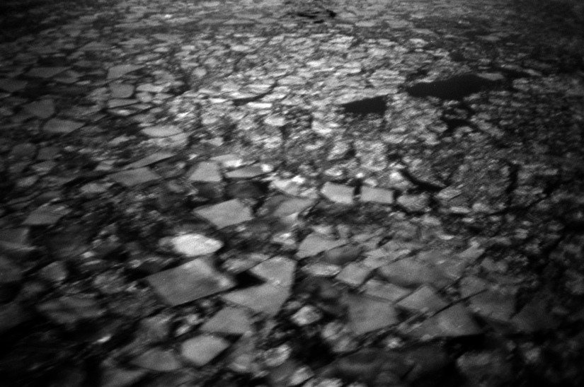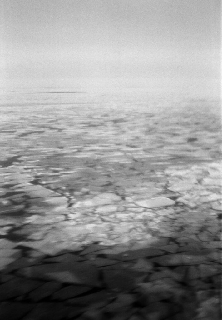 The ship on which I am standing when I made these photos is moving and so there is a blur, and a sense of motion in the images. While it is me who moves, the sea ice also moves and flows. So there is this communication of movement too. This is especially true as the camera shutter speed is 1/8th of a second. The ‘slow’ shutter speed is needed for their to be sufficient light that an image is created on the film and its chemical coating but it does not ‘freeze’ the image!
